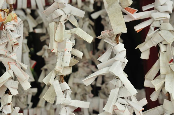 Thousands of paper strips tied to pine rods dominate the temple grounds. I fear the multitude of curses and bad fortunes others have tried to leave behind. Still, I make my donation and follow ancient customs. Trembling hands clutch the paper. I read my destiny and press the god’s great blessing into my soul.